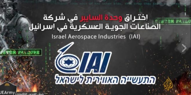 في ضربة جديدة لأمن المعلومات الصهيوني، شنت مجموعة تطلق على نفسها جيش القدس الإلكتروني هجوما إلكترونيا على جهاز مدير قسم السايبر في شركة الصناعات الجوية العسكرية (IAI) وهي أهم الشركات الأمنية والعسكرية في دولة الاحتلال.