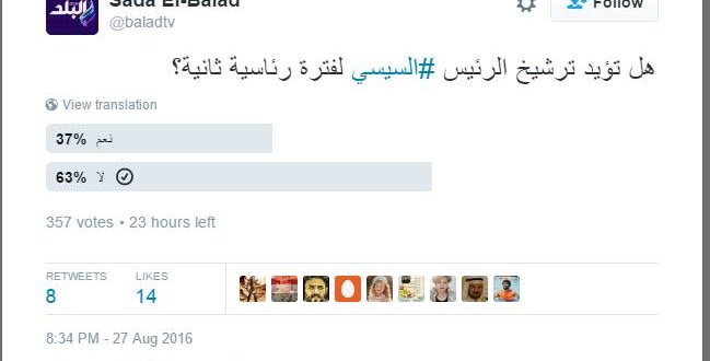 وقامت “صدى البلد” بحذف استفتاء أجرته على صفحتها الرسمية على موقع تويتر للتواصل الاجتماعي حول ترشيح عبدالفتاح السيسي لولاية رئاسية ثانية، بعد أن رفض غالبية المشاركين في الاستفتاء الأمر.