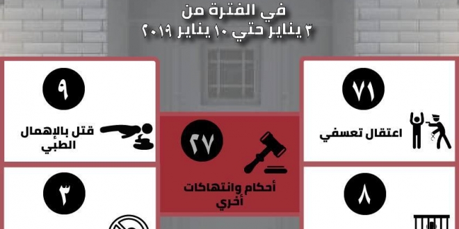 ورصدت «شبكة المدافعين عن حقوق الإنسان» 118 انتهاكًا لحقوق الإنسان في مصر خلال الأسبوع الماضي، منذ يوم 3 يناير حتى 10 يناير 2019، شملت 71 حالة اعتقال تعسفي، و8 حالات إخفاء قسري، و9 حالات قتل بالإهمال الطبي، و3 حالات من الإهمال الطبي بالسجون، و27 حالة محاكمات وانتهاكات أخرى.