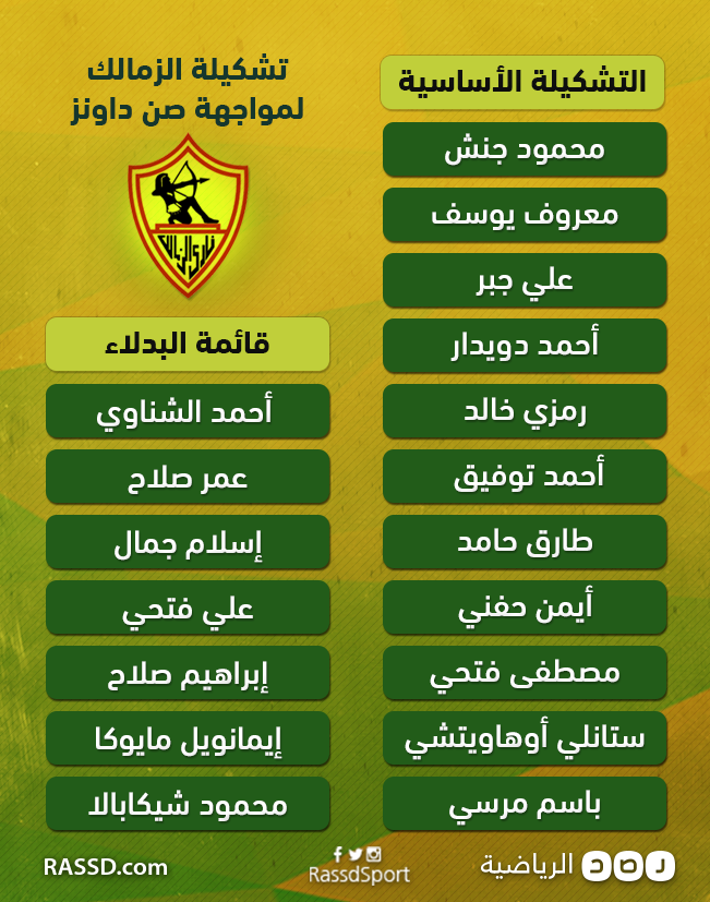 وتضم قائمة البدلاء كلًا من أحمد الشناوي وعمر صلاح وإسلام جمال وعلي فتحي وإبراهيم صلاح وإيمانويل مايوكا ومحمود عبد الرازق “شيكابالا”.