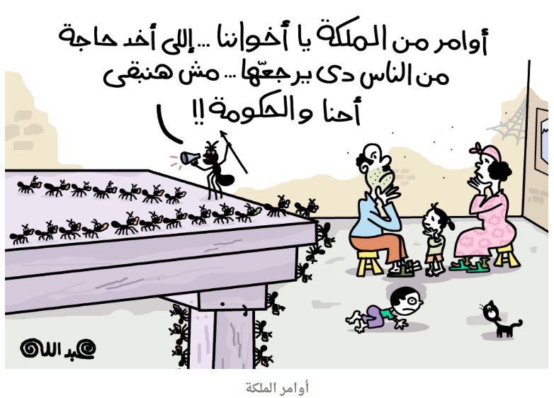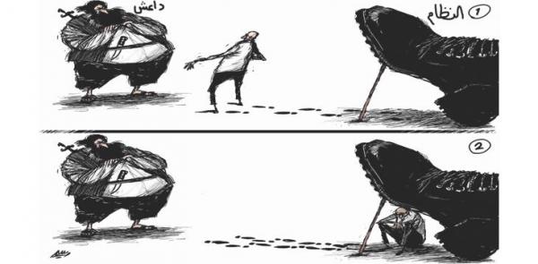 وفي الشأن العربي، نشر “الشرق الاوسط” كاريكاتيراً، يوضح كيف تجعل الانظمة شعوبها تلجأ إليها بالرغم من فسادها، وذلك بخلق عدو أكبر لهم.