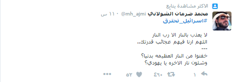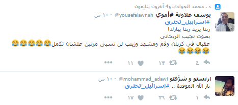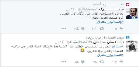 وحقق الهاشتاج المركز الأول بقائمة الهاشتاجات الأكثر تداولاً داخل مصر، وأعرب المغردون عن بالغ سعادتهم، معتبرين أنه عقاب من الله بعد أن منعوا الآذان بالقدس المحتلة، بينما سخر آخرون من الحادث وربطوا بينه وبين حديث “السيسي”، الذي قال فيه إنه جلس 10 سنوات ثلاجته لا تحتوي إلا على المياه”، وقال أحدهم “نتنياهو يتصل بــ السيسي ويطلب منه المساعدة وإرسال المياة اللي في تلاجته علشان يطفي بيها الحريق”.