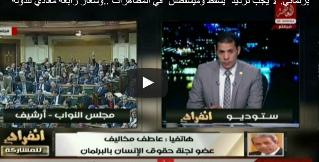 اعتبر عاطف مخاليف، عضو برلمان العسكر، أن رفع شعار رابعة وهتاف “يسقط حكم العسكر” خلال المسيرات، من الأشياء المعادية للدولة وتهدد استقرارها.