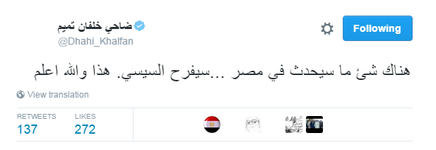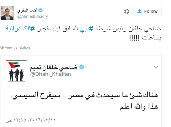 وفي الساعة الثامنة والربع صباحًا، أي قبل ساعات من وقوع الانفجار، غرد خلفان: “هناك شيء ما سيحدث في مصر، سيفرح السيسي. هذا والله أعلم”.