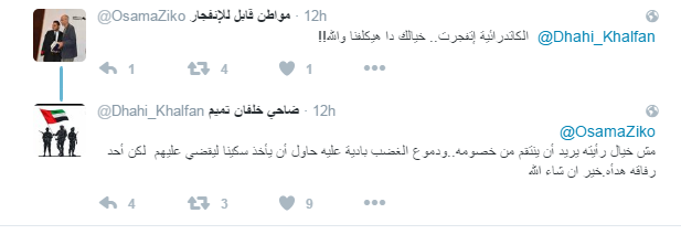وبعد وقوع الانفجار، انهالت الردود الساخطة من الناشطين المصريين ضد خلفان، إلا أنه رد قائلا: “مش خيال رأيته يريد أن ينتقم من خصومه.. ودموع الغضب بادية عليه”.