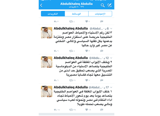 قال الأكاديمي الإماراتي البارز عبد الخالق عبد الله، مساء السبت، ان هناك إحباطًا متزايدًا في الخليج من النظام المصري الذي تحول “إلى عبء سياسي ومالي يصعب تحمله طويلا”، على حد تعبيره .