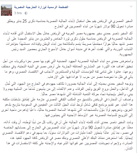 ضمن سياسة الاستجداء بالتبرعات، أطلق السفير المصري في الرياض ناصر حمد، مباردة تحويل 90 دولار شهريًا من كل مصري يعمل في الخارج، خلال حفلًا في السفارة المصرية، بمناسبة ذكرى ثورة 25 يناير.