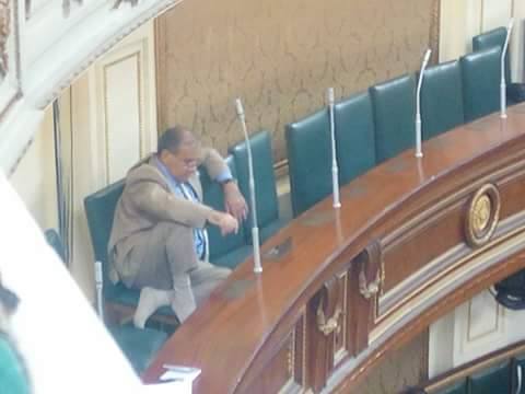 داول مستخدمو موقع التواصل الاجتماعي “فيس بوك” صورة للنائب حمدى السيسى نائب الهرم خلال جلسته، يوم الإثنين، فى البرلمان، متكئاَ على كرسى البرلمان ناظرًا إلى الأرض متأملاً وخالعًا حذاءه.