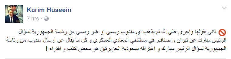 وقال في تدوينة عبر حسابه على موقع التواصل الاجتماعي «فيس بوك»: «تاني بقولها وأجري على الله، لم يذهب أي مندوب رسمي أو غير رسمي من رئاسة الجمهورية لسؤال الرئيس مبارك عن تيران وصنافير في مستشفي المعادي العسكري، وكل ما يقال عن إرسال  مندوب من رئاسة الجمهورية لسؤال الرئيس مبارك واعترافه بسعودية الجزيرتين هو محض كذب وافترا».