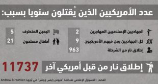 كشفت إحصائية أعدتها منظمة “هيومن رايتس ووتش” عن تعرض 11737 أميركي لإطلاق نار من أميركي أخر سنويًا، ومقتل 963 من أخرين على يد الشرطة في جميع الولايات، بينما قتل 9 على يد كل الجهاديين بمن فيهم الأميركيين، وقتل 21 على يد أطفال مسلحين، و 5 برصاص اليمين المتطرف، وإثنان على …